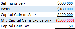 In all of these scenarios, because of the generous $500,000 exclusion for married couples filing jointly, there would be no Capital Gains Tax paid by them.