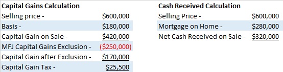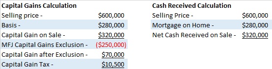 Mortgages. The capital gains calculation has nothing to do with how much you owe on your mortgage, unless you have used the mortgage to improve your home. If the mortgage was used to buy cars, pay off debt, etc. it cannot be added to the basis of the home when calculating capital gains. Here is the same scenario on capital gains, and the actual cash you receive from selling your home. In this scenario the single person, took out a second mortgage to pay off $100,000 in student debt.